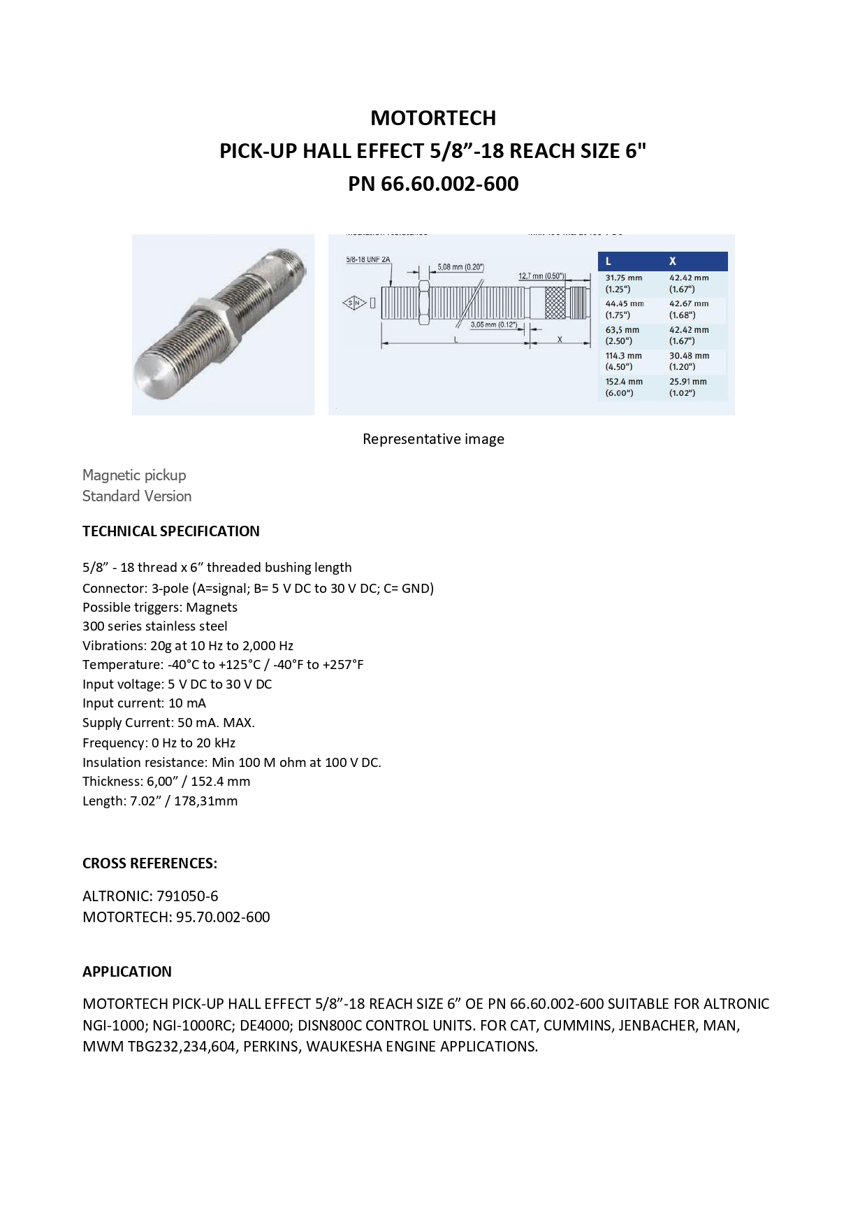 MOTORTECH PICK-UP HALL EFFECT 5/8-18 REACH SIZE 6.0” OE PN 66.60.002-600 SUITABLE FOR ALTRONIC NGI-1000, NGI-1000RC, DE4000, DISN800C CONTROL UNITS. FOR CAT, CUMMINS, JENBACHER, MAN, MWM TBG232,234,604, PERKINS, WAUKESHA ENGINE APPLICATIONS.