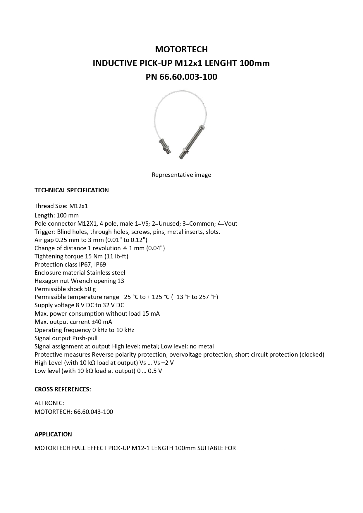 MOTORTECH INDUCTIVE PICK-UP OE PN 66.60.003-100 FOR JENBACHER AND VARIOUS ENGINES APPLICATIONS. REPLACED BY 66.60.043-100.