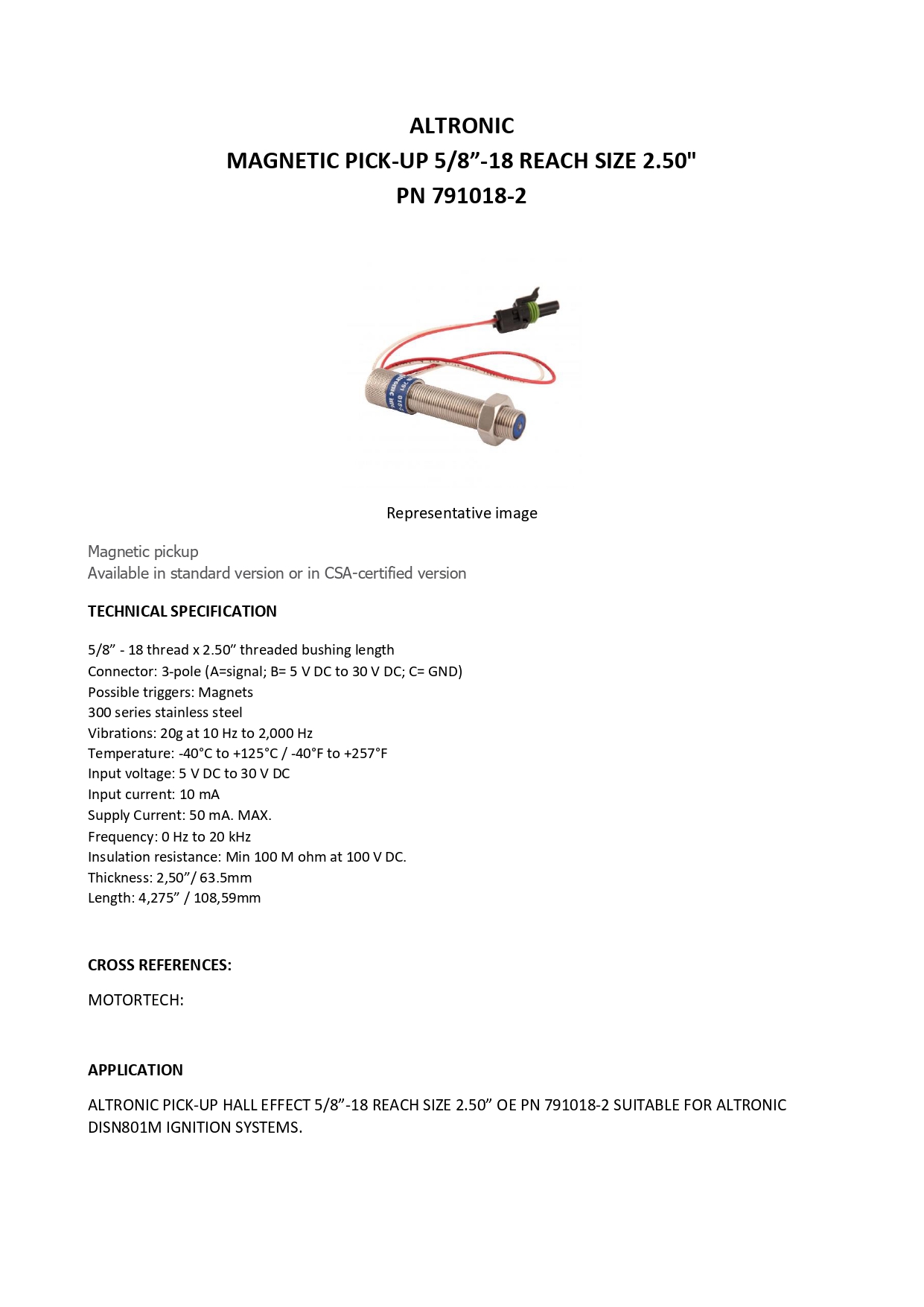 ALTRONIC MAGNETIC PICK-UP 5/8-18 REACH SIZE 2.50” OE PN 791018-2 SUITABLE FOR ALTRONIC DISN801M IGNITION SYSTEMS.