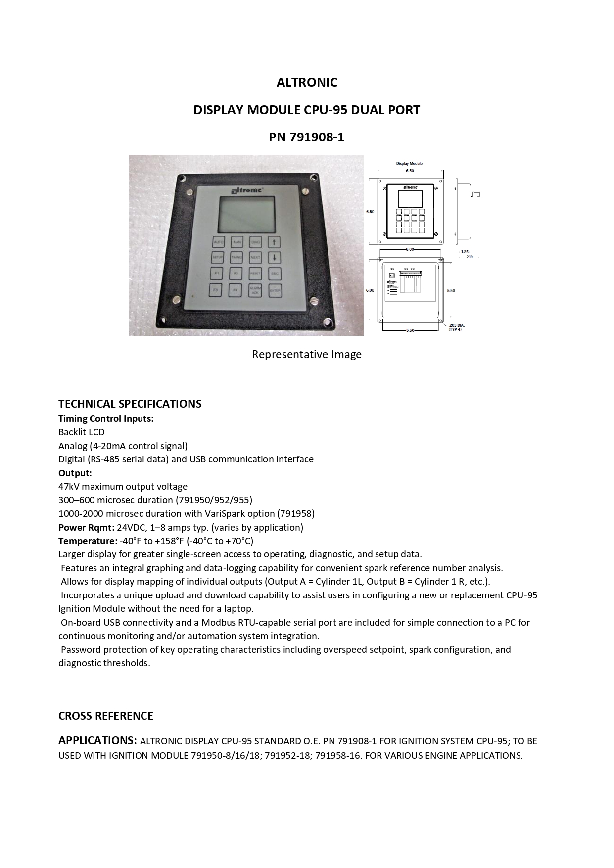 ALTRONIC DISPLAY CPU-95 ENHANCED O.E. PN 791909-1 FOR IGNITION SYSTEM CPU-95, TO BE USED WITH IGNITION MODULE 791950-8/16/18, 791952-18, 791958-16. FOR VARIOUS ENGINE APPLICATIONS. REPLACED BY 791909-1.