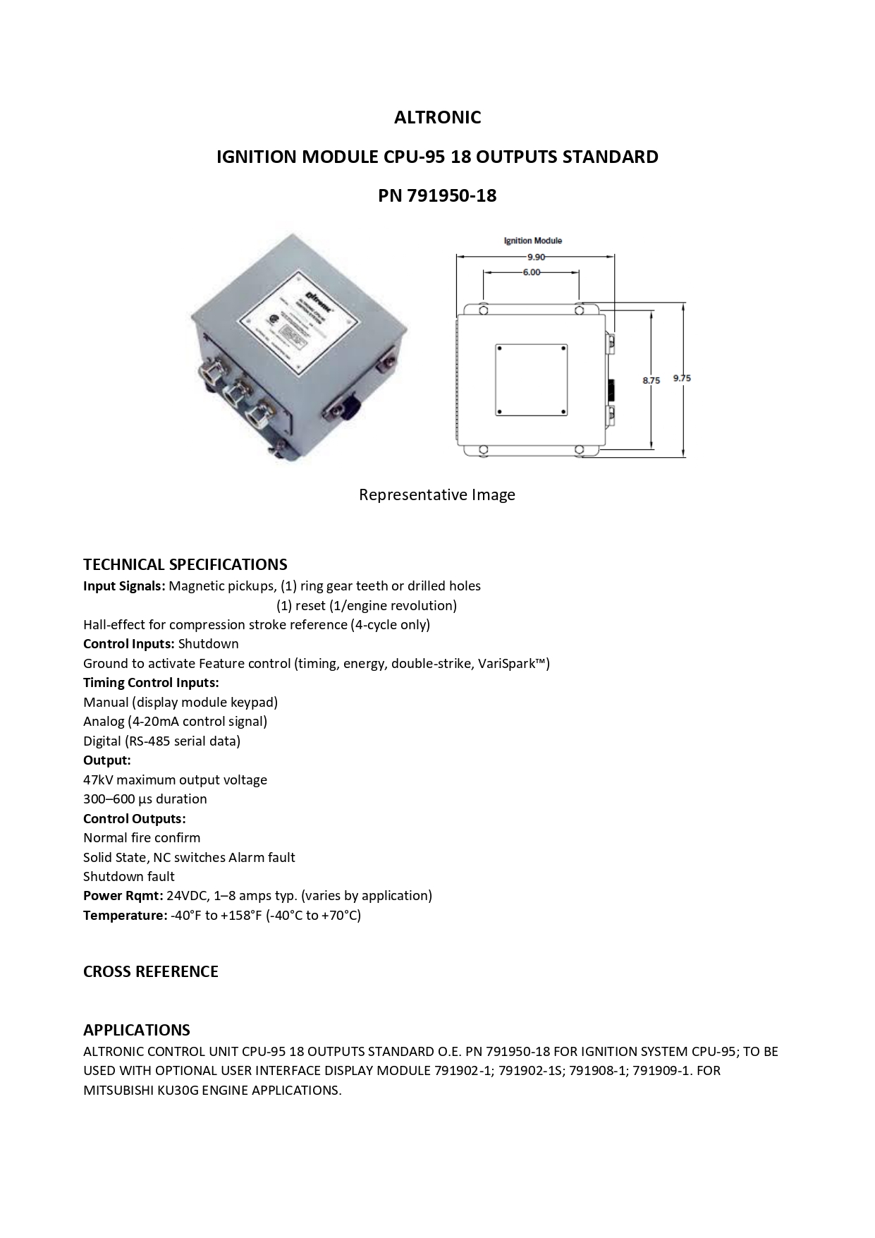 ALTRONIC CONTROL UNIT CPU-95 18 OUTPUTS STANDARD O.E. PN 791950-18 FOR IGNITION SYSTEM CPU-95, TO BE USED WITH OPTIONAL USER INTERFACE DISPLAY MODULE 791902-1, 791902-1S, 791908-1, 791909-1. FOR MITSUBISHI KU30G ENGINE APPLICATIONS.