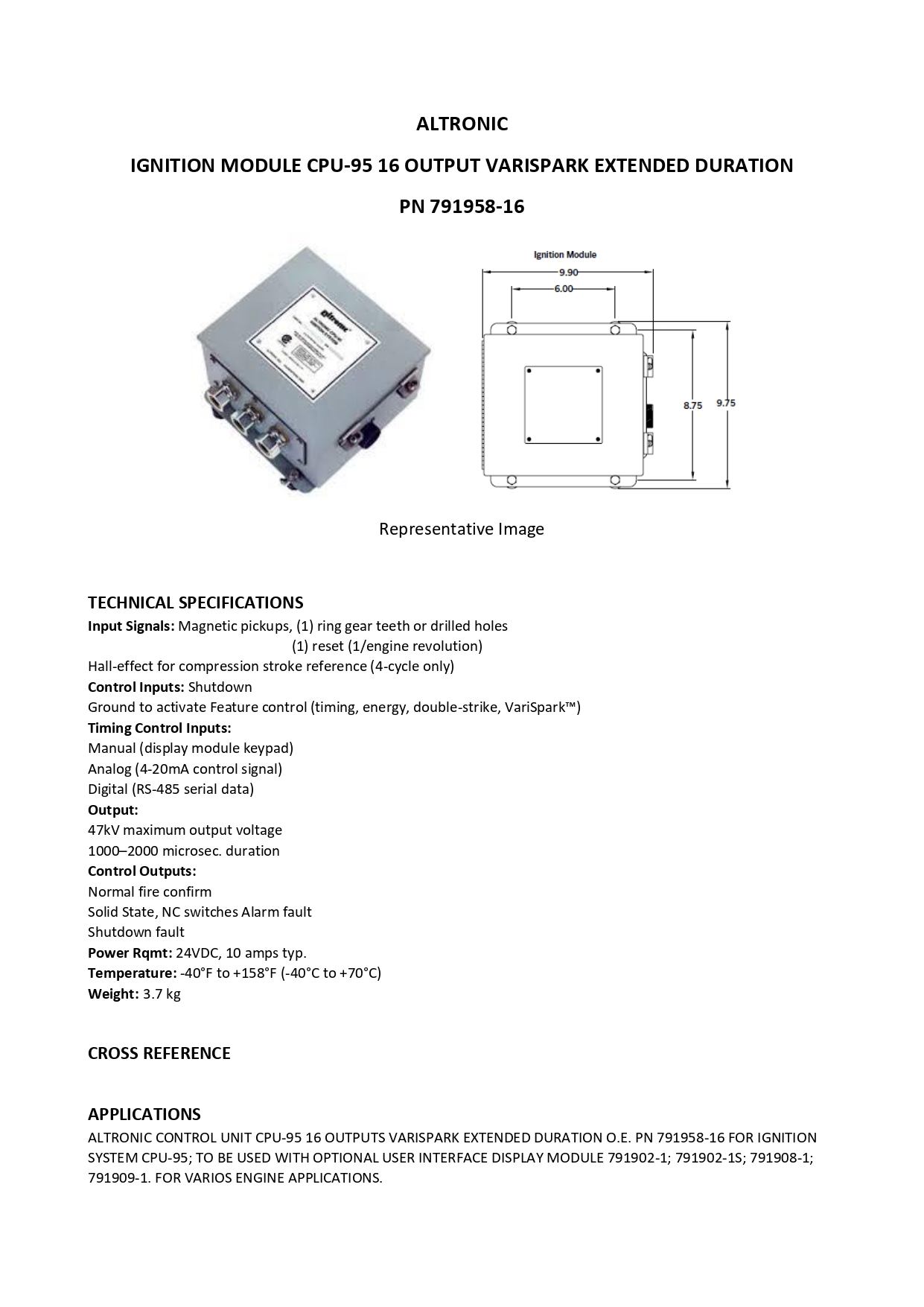 ALTRONIC CONTROL UNIT CPU-95 16 OUTPUTS VARISPARK EXTENDED DURATION O.E. PN 791958-16 FOR IGNITION SYSTEM CPU-95, TO BE USED WITH OPTIONAL USER INTERFACE DISPLAY MODULE 791902-1, 791902-1S, 791908-1, 791909-1. FOR WORTHINGTON, SUPERIOR, INGERSOLL RAND, CLARK, COOPER, AJAX VARIOUS ENGINE APPLICATIONS.