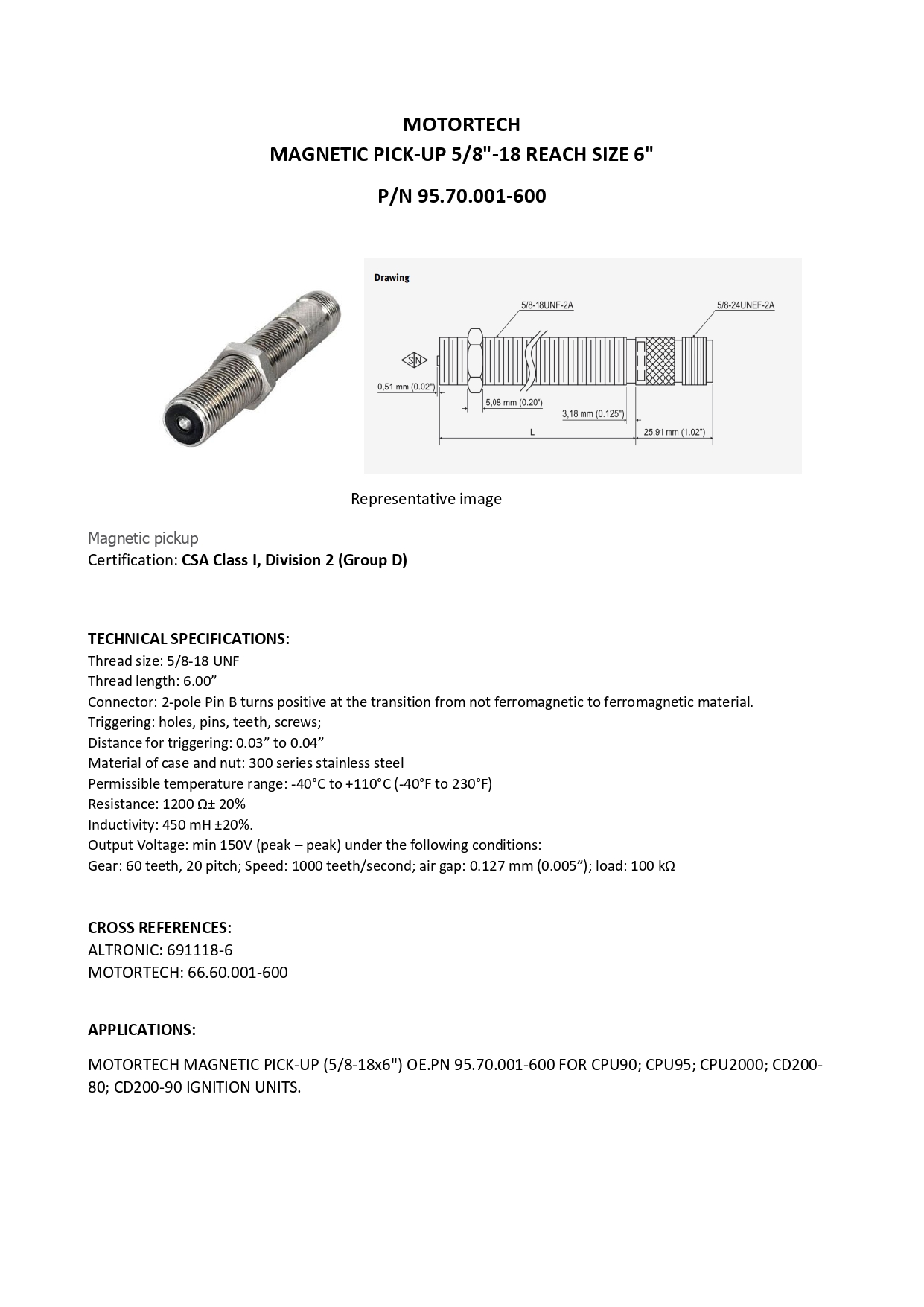 MOTORTECH MAGNETIC PICK-UP CSA (5/8-18×6”) OE.PN 95.70.001-600 FOR CPU90, CPU95, CPU2000, CD200-80, CD200-90 IGNITION UNITS.
